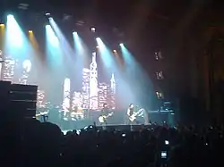 The band members were modeled using motion capturing performed by actors hired by Harmonix, incorporating video and concert footage to create avatars for each member unique to each venues.[18][19] The band's support team helped to take photographs of the band member's tattoos, and identified when they were received so that the Harmonix artists could incorporate them properly into the avatars.[20] All the songs, including the six Green Day songs previously released as downloadable content, feature unique animations tied to each song. This was a different approach than as taken for The Beatles: Rock Band, where they created snippets of framing and animation which could be easily repackaged for other songs, including future downloadable content. Because of the integrated nature of the songs and animations, there will be no further downloadable content available for the game.[3] The game includes, as reward items, over 100 photographs and 40 minutes of video footage pulled from Warner Bros. Records' archive of the band. The video content has been pared down from over 20 hours of raw footage from concerts and studio records. Some of the live video footage will be used as part of the 21st Century Breakdown venue backdrops.[4] Many of these rewards are specific to individual songs, such as photos taken during concert performances of the song, and thus given as rewards for completing these songs.[3]