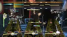 Green Day: Rock Band allows players to perform simulated rock music by providing up to four players with the ability to play three different controllers modeled after music instruments: a guitar controller for lead guitar and bass guitar gameplay, a drum controller and a microphone for vocals. Players simulate the performance of rock music by using their controllers to play scrolling on-screen notes. For lead and bass guitar, this is accomplished by holding down colored buttons mimicking guitar frets and pushing the controller's strum bar. For drums, this requires striking the matching colored drumhead, or stepping on the pedal to simulate playing bass drum notes. When singing vocals, the player must sing in relative pitch to the original vocals. A pitch indicator displays the singer's accuracy relative to the original pitch. The game supports harmonies as introduced in The Beatles: Rock Band, allowing multiple singers to perform the vocal portion.[2] Harmonies will be added to the six songs already available as downloadable content for the game when played in Green Day: Rock Band.[3]