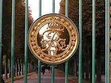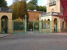 The Green Gate (German: GrĂ¼nes Gitter) in Potsdam is the main gateway into Sanssouci Park and is situated at the end of the avenue to Sanssouci Palace. This begins as one of three roads that radiate from the Luisenplatz square. The gate was designed by Ludwig Ferdinand Hesse and was put up in 1854 as part of the construction of the Church of Peace. Its name comes from the colour in which the gate was painted. Additional ornamentation is provided by individual bars and points being picked up in gold leaf. The iron gate bears the initials of Frederick William IV.