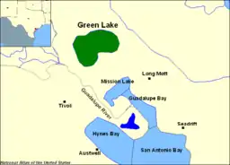 Green Lake is a natural tidal lake in Calhoun County, Texas, on the Guadalupe River flood basin. Known for its greenish waters, from which its name derives, the lake is located 12 miles (19 km) west of Port Lavaca and 22 miles (35 km) south of Victoria on the Gulf Coastal Plain. Despite being less than 3 miles (4.8 km) from the coast of San Antonio Bay, its waters are fresh.[1] It is the largest natural freshwater lake entirely in Texas, covering an area of approximately 10,000 acres (40 km²).[2]