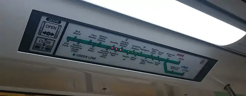 The line was opened in two stages, with the 15.1 km Inderlok - Mundka section opening on 3 April 2010[2] and the 3.5 km Kirti Nagar - Ashok Park Main branch line on 27 August 2011. Though its route is shorter than other lines, the Green Line serves as a lifeline for Delhiites going to and coming from Red and Blue Lines, as it covers major commercial and residential areas like Punjabi Bagh, Paschim Vihar, Nangloi and Mundka.