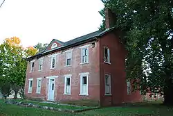 The building was programmed by David V. Robinson and constructed by Jesse Russell and Daniel Grumbly. The building is rendered primarily in both the Federal and Greek-Revival styles, but retains elements of the Georgian period that architectural historian Clay Lancaster noted as "Georgian Survival." The exterior of the building is designed primarily in the Federal style which is accomplished by the emphasis that has been placed upon the central bay of the symmetrically aligned building. The building displays no brick belt course that would be characteristic of the previous Georgian style, nor does it utilize the temple form of the later Greek Revival period. The pedimented gable over the central bay is a distinct characteristic of the Georgian period of architecture. The building's carved limestone lintels above its facade windows and door feature circular bosses on both ends which are characteristic of the Greek Revival period. The interior radiates from a central hallway that traverses three floors. The plan is nearly symmetrical on all floors. Robinson, Russell and Grumbly possibly used the pattern books of Asher Benjamin and Owen Biddle Jr. to create a plan and details for the academy building, as many of the details align in form with the designs featured in Benjamin and Haviland's pattern books.