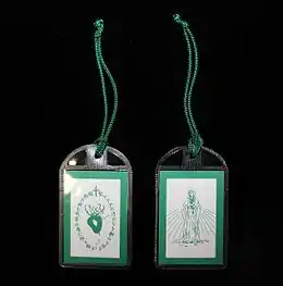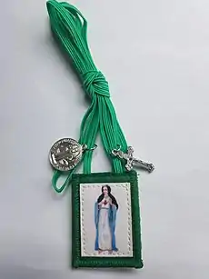 The Green Scapular (also called The Badge of the Immaculate Heart of Mary) is a Roman Catholic devotional article approved by Pope Pius IX in 1870. It is called a scapular due to its appearance, but is not descended from the scapulars that form part of the habit worn by religious orders.[1] It can be more accurately described as a "cloth medal". It is unique among Catholic scapulars, as it the only scapular which has only one badge of cloth, while all others have at least two.