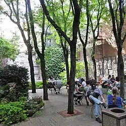 The 6,360-square-foot (591 m2) park was assembled from three lots, which had previously been occupied by a store, a garage, and part of a synagogue. It features a 25-foot (7.6 m) waterfall, a trellis with heat lamps for chilly days, chairs and tables, as well as honey locust trees, azaleas, and pansies, which together attract an average of 700 visitors a day.[2]