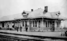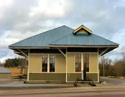 The depot is a one-story frame structure measuring 30 feet (9.1 m) by 82 feet (25 m), and clad in weatherboard and bead board. It was a "combination depot," meaning it housed both passengers and freight (stations for larger cities often had separate depots for passengers and freight). The southern half of the building's roof is hipped, and includes south-facing and west-facing dormers. Most of the windows are four-over-four double-hung sash windows with wooden frames, the exception being a clerestory window on the north wall. The depot retains its original wooden doors. Rolling track doors are located on the east side of the building.[1]