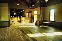 The passenger area, in the southern half of the building, was originally divided into three sections: the colored waiting room in the southeast corner (still enclosed), the general waiting room in the southwest corner, and the ticket agent's office adjacent to the waiting rooms. A baggage area lay between the ticket office and the freight area.[1] The interior has exposed rafters and pendant lights. The original slate roof was replaced with a metal roof in the 1980s, which was in turn replaced in 2012. The roof has been painted gray to match the color of the original roof.[1]
