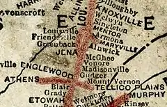 The L&N's new Cincinnati-Atlanta line continued southward from Knoxville through Maryville, Vonore, and Madisonville before reaching Etowah (the tracks along this line are still used by CSX). At Mentor (just north of modern Alcoa), a side route branched off from the main line, and looped around through Louisville, Friendsville, and Greenback, before rejoining the main line at Jena (a community once located where the tracks cross modern Highway 95). In the early 1900s, the L&N constructed a number of elaborate depots along this line, including the Richard Monfort-designed L&N Station in Knoxville and the Etowah Depot in Etowah. Construction of the Greenback Depot began in 1913, and was completed the following year.[1]