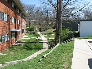 Landscaping was integrated into the design, with mature specimen trees saved or transplanted during site development. Each of the group housing units had a plot 30 feet (9.1 m) by 90 feet (27 m) between the house and the parklands, cared for by the tenant. On the service side space was provided for trash storage and clothes drying. Landscaping was used to create privacy, and the finished community was notable for the maturity of the plantings.[5]