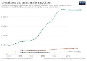 China experienced an increase in electricity demand and usage in 2017 as the economy accelerated.[24] According to the Climate Data Explorer published by World Resources Institute, China, the European Union, and the U.S. contributed to more than 50% of global greenhouse gas emissions.[25] In 2016, China's greenhouse gas emissions accounted for 26% of total global emissions.[26] The energy industry has been the biggest contributor to greenhouse gas emissions since the last decade.[25]