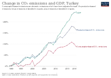 On average the consumption-based CO2 emissions of one of the richest 10% of people in Turkey is more than double that of someone in the rest of the population,[205] as richer people tend to fly more and buy gasoline-fuelled SUVs.[206] Nevertheless 2019 studies disagree on whether Turkey's high income inequality causes higher CO2 emissions.[207][208]