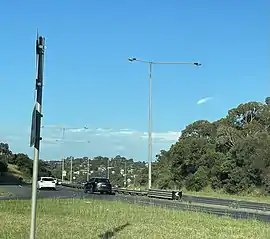 In the late 1980s, the northern section of Greensborough Road south of Grimshaw Street was extended and significantly altered, with the original road north of Lenola Street in Macleod re-aligned to the west as a service road, the new road being a divided highway up to a new intersection at Grimshaw Street. North of here the road was extended as a single carriageway bypass road, sweeping north-west around central Greensborough and terminating at a large roundabout interchange with Diamond Creek Road and Civic Drive, known locally (and sign-posted) as the Greensborough Bypass. The original alignment north of Nepean Street was repurposed for local traffic only, still known today as Greensborough Road.[3] Construction on the northern half, the 3 km section between Grimshaw Street and Diamond Creek Road, started in 1985[4] and opened in March 1988[5] (this section was later declared a State Highway in 1989[6]); construction on the southern half, the 2 km section between Grimshaw and Lenola Streets, started in late 1985,[7] and opened in September 1989.[8]
