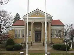 Greensburg Carnegie Public Library, also known as Greensburg City Hall, is a historic Carnegie library located at Greensburg, Decatur County, Indiana. It was built in 1904, and is a one-story, cruciform plan, tan brick building in the Classical Revival style. It is topped by a red terra cotta tiled gable roof and central drum and saucer dome. It features a projecting front portico supported by paired Ionic order columns. Its construction and furnishing was funded by a $15,000 grant provided by Andrew Carnegie.[2]: 5–6, 9