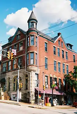 The Greensburg Downtown Historic District of Greensburg, Pennsylvania, is bounded approximately by Tunnel Street, Main Street, Third Street, and Harrison Avenue.[2] It consists of 62 buildings on 21.8 acres (8.8 ha), with the most notable buildings from the years 1872-1930. The district's oldest structure (1872) is the former Masonic Temple at 132 South Main Street. The Academy Hill Historic District is directly to the north of downtown Greensburg.