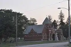 A bell tower, part of the original structure, is located on the corner of the front-gabled east wing. A small tower was added to the west wing. The chapel is used for funeral services, seats 100 people, and is located in the east wing. The west wing contains office space.[2]