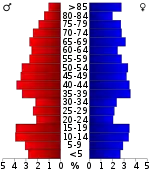 In the county, the population was spread out, with 23.70% under the age of 18, 6.50% from 18 to 24, 23.20% from 25 to 44, 23.70% from 45 to 64, and 22.80% who were 65 years of age or older. The median age was 43 years. For every 100 females there were 95.50 males. For every 100 females age 18 and over, there were 91.50 males.