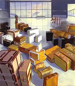 His "Baggage Paintings" (1987–90) depict plush period gear in apparently random but carefully composed states—stacked (Samson and Delilah), rifled through (Customs), grouped (Deposed or Baggage Claim)—that imply allegories of identity, luxury and privacy, and toy with conventions of literature and representation, such as the still life, landscape and Minimalism.[8][3][27] Critics such as Robert Berlind describe them as meticulously detailed with "virtuosic, fluid brushwork" emphasizing the play of reflected light and color and a playful style that lulls viewers into a "cheery complicity" often undermined by darker elements.[3][8] With Samsonite (1990)—a wide-open, empty suitcase with fabric lining like rumpled sheets, implying a private, sexual component—Drasler signaled his shift in the next two decades to interiors as sites for exploring subjectivity.[27]