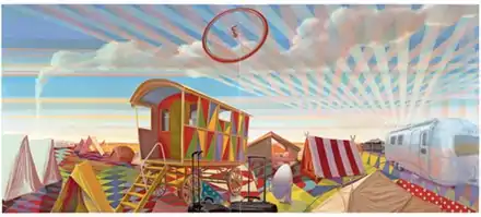 With the show "On the Lam" (2011), Drasler examined automobile interiors as sites of independence, seclusion, fantasy, and a cinema-like screening of experience.[4][2][18] He packed the pictorial frames (including the depicted windscreens) of works such as On the Lam with objects, decorative and Native American patterns (Rain Dance), and Americana travel references.[4][22] Reviewers have described these paintings as raucous works of visual wit and poignancy,[4] nostalgic evocations of 1950s interstate travel, old hand-colored postcards and 1960s concert posters,[2][18] and fantastical, inexplicable assemblages that simultaneously recall elements of the work of Roger Brown, the Pattern and Decoration movement, and Philip Pearlstein.[22]