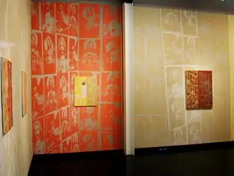 In his "Tattoo Parlor" series, Drasler continued to explore wallpaper patterns (on canvas and as an installation environment), using familiar iconography and playing off the idea of the imprint places leave on their occupants.[38] His "Jesus Wallpaper" consisted of straightforward, loosely rendered iconic images of Jesus, which appeared as backgrounds in a series of room paintings (1995–7) of assorted hanging objects (jumper cables in Jumping Jesus, a wallet in Profit, a pencil in 2B Jesus).[38] "Tattoo Parlor" was fully realized—with the paintings hung on hand-painted, Jesus Wallpaper-patterned walls—during his residency at Djerassi Foundation (1996) and in installations at PS1 (the group show "Get Busy", 1997) and California State University at Fullerton (solo show, 2005).[38] Drasler also employed pattern in his "Hats Paintings" (1988–2012), approaching abstraction in canvasses filled edge-to-edge with seas of anonymous men in subtly shaded fedoras, their faces turned away or hidden beneath the hats.[1][14][37]