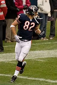 In 2009, Olsen quickly developed a rapport with Jay Cutler, whom the Bears had acquired from the Denver Broncos. Olsen and Cutler connected for 60 receptions, for 612 yards, and eight touchdowns.[22] He led the Bears in receptions and touchdowns, while finishing behind Devin Hester for most receiving yards.[23] Before the 2010 season the Bears fired Ron Turner and hired Mike Martz as offensive coordinator. His numbers dropped compared to his 2008 and 2009 seasons, as he recorded 41 receptions for 404 yards, and five touchdowns.[24] However, Olsen helped the Bears win their first 2011 playoff game against the Seattle Seahawks, catching three passes for 113 yards and two touchdowns.[25]