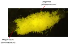 Gregarina garnhami is a eukaryotic unicellular organism belonging to the Apicomplexa described in 1956 by Canning as a parasite found in several locusts, such as the desert locust, African migratory locust, and Egyptian locust. Especially, the desert locust is the host for this species, as up to 100% of animals can become infected.[1] An estimated thousands of different species of gregarines can be in insects and 99% of these gregarines still need to be described. Each insect is said to host multiple species.[2][3] A remarkable feature of G. garnhami is its autofluorescence.