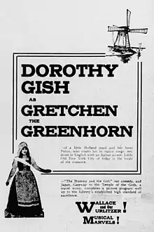 Gretchen the Greenhorn is an American silent film released in 1916. The film stars Dorothy Gish as a Dutch girl who emigrates to America to be with her father; they become entangled with a counterfeiting ring.[1] Set in an immigrant section of an American city, the film avoids heavy stereotyping, according to the booklet accompanying the DVD release notes.