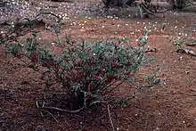 This grevillea grows in mulga between Laverton and the upper Gascoyne River and between the Thomas River and Mount Singleton in Avon Wheatbelt, Carnarvon, Gascoyne, Geraldton Sandplains, Murchison and Yalgoo biogeographic regions of central inland Western Australia.[2][3]