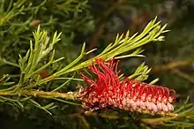 Grevillea fastigiata is an erect shrub, typically 2.0–2.5 m (6 ft 7 in – 8 ft 2 in) high with clustered branches. The leaves are linear, 18–45 mm (0.71–1.77 in) long, sometimes with three to seven rigid, sharply-pointed, linear lobes 5–20 mm (0.20–0.79 in) long and 0.8–1.2 mm (0.031–0.047 in) long near the ends. The edges of the leaves are rolled under, obscuring most of the lower surface. The flowers are erect in toothbrush-like clusters along a rachis 45–80 mm (1.8–3.1 in) long. The flowers are pale brown to scarlet with an orange-red to scarlet style and the pistil is 19–22 mm (0.75–0.87 in) long. Flowering occurs from September to March and the fruit is a follicle about 10 mm (0.39 in) long.[2][3]