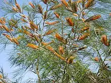 Plants from Queensland are non-lignotuberous shrubs to small trees with smooth bark and lighter inflorescences than other forms. A prostrate form which spreads up to 5 m (16 ft) across is found on exposed areas near Cooktown in north Queensland. Plants from Western Australia and the Northern Territory grow as a rough-barked lignotuberous shrub to small tree. A population of this last form from Kakadu National Park has all-silvery leaves.[4]