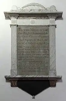 Grey died suddenly in 1801 at his home and was buried at All Saints Church, Worlington.[4] He had married twice; firstly in 1753 Margaret, the daughter of Sir Henry Grey, 1st Baronet, of Howick, Northumberland and secondly, in 1762, Elizabeth Kennedy of Newcastle upon Tyne, with whom he had 2 sons and 2 daughters.[2] He was succeeded to his "title" and estate by his son, Sir Frederic Grey-Cooper, Bt.