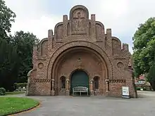The wall and entrance gate to the cemetery were built in 1853. The gate was designed by Henning Wolf, the wall by Ferdinand Meldahl. They collaborated on the design of Greyfriars Chapel which was completed in 1857 with inspiration from Venetian architecture. The chapel is an early example of the Historicist style which would dominate Danish architecture for the rest of the century. It is also notable for its decorative brickwork.[3]