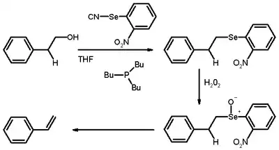 The alcohol first reacts with o-nitrophenylselenocyanate and tributylphosphine to form a selenide via a nucleophilic substitution on the electron-deficient selenium. In the second step, the selenide is oxidized with hydrogen peroxide to give a selenoxide. This structure decomposes to form an alkene by an Ei elimination mechanism with expulsion of a selenol in a fashion similar to that of the Cope elimination. This reaction takes part in the synthesis of ring C of the Danishefsky Taxol synthesis.