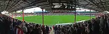 - New Road Stand – A single-tiered all-seated stand located along the New Road.[48] During its final years it was officially named the Bill Axbey Stand, as a tribute to the club's oldest-ever supporter.[53] The away supporters' section was housed in the northwest corner of the stand until October 1991.[54] Previously a terrace, the stand was converted to seating during the 1996 off-season.[1] In 2010, at the request of then-manager Andy Scott, the dugouts were relocated in front of the stand.[55][56] The central camera position for TV broadcasts of games was located in a gantry suspended from the roof of the stand.[57] The Family Section was located in blocks N506, N507 and N508.[25]