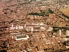 Little development occurred at Griffin Park between the mid-1930s and the mid-1980s and the ground's 38,000 capacity was the largest in its history.[3][9] The frontage of the Braemar Road stand was rebuilt in 1963, adding club offices and a club room.[10] Flats were built in a spare, matchday parking area behind the Ealing Road terrace in 1985 and the following year the Brook Road 'kop' was torn down and replaced by a two-tiered stand,[3] colloquially known as the 'Wendy House'.[11] On the New Road side of the ground, the 1930s extension to the terrace was removed and a sheet metal wall was added to the back of the stand.[3]