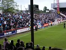 - Braemar Road Stand – A two-tiered all-seated stand located along the Braemar Road,[48] with the lower tier being known as 'the Paddock'.[49] The stand also housed the dressing rooms, supporters' bar and club offices.[50] The stand's forecourt housed the club shop and ticket office.[51] Until 2010, the dugouts were located in front of the stand.[52]