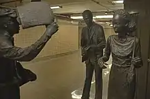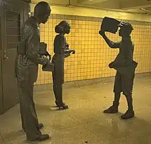 He is well known for his sculpture, with his most famous work being The Commuters.[22][23] Sculpted in 1985, The Commuters is the result of a commission.[24] The series of seven statues, which depict commuters from 1935, are plaster casts from real life figures, created and donated in 1984 by a class from the Newark School of Fine and Industrial Art.[25] Gurevich then had the life-sized figures, as well as a ticket booth, cast in bronze.[26] The piece is now on permanent display in Newark's Penn Station.[27]