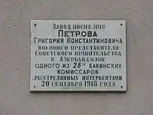 Grigory Constantinovich Petrov (Russian: Григорий Константинович Петров) (1892-20 September 1918) was a Russian Left Socialist-Revolutionary activist in Baku, Azerbaijan, during the Russian Civil War. Petrov became one of the 26 Baku Commissars of the Soviet Commune that was established in the city after the October Revolution. He was the Military Commissar of the Baku region. When the Commune was toppled by the Centro Caspian Dictatorship, a British-backed coalition of Dashnaks, SRs and Mensheviks, Petrov and his comrades were captured by British troops and executed by a firing squad between the stations of Pereval and Akhcha-Kuyma of Transcaucasian Railroad on the night of 20 September 1918.