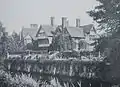 The house was designed in 1870 by Richard Norman Shaw for the Victorian era painter Frederick Goodall, who had purchased 110 acres (0.45 km2) of land[2] at Harrow Weald in 1856, but he did not begin to build until a lease on the property expired. Shaw's design for the house included aspects of Gothic revivalism, added to a late-Elizabethan style, which included high red-tiled gables, tall clustered chimneys and leaded lights. To the north of the house, Shaw built a small lodge, a walled garden and various outhouses and a stable block, later converted into garages by W. S. Gilbert for his collection of motorcars.[3] Over the dyke (now a duck pond) Shaw built two stone bridges, which incorporated flint from the ruined church at Stanmore.[4] Construction on the house was completed in 1872. Goodall's ground-floor studio was built on a north-south axis in order to catch the light. Goodall sold the property in 1880 to Robert Herriot of Hambros Bank, who added a billiard room in 1883.[5] Windsor Castle is visible from the house.[1]