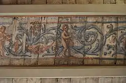 The fully decorated pine ceiling was one of many examples in Hamburg merchant houses, but is probably the only 17th century example to remain accessible.[1] The painting is by an unknown artist on pine boards, 151 of which are still preserved. In the Hamburg Museum it is reconstructed on 17 joists with a further 68 boards added. The Baroque artwork includes putti and other figures in playful and bawdy acts. Within the image, there are several jokes: it shows Cain and Abel, referring to an old Hamburg saying, that "The Grimm" is the oldest street in the world, because according to the Bible, Cain slew Abel "im Grimm" ("in a rage").