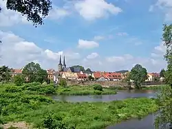 The river Mulde flows through the town, a significant section of which is situated in a floodplain. Massive floods in 2002 washed away the old Pöppelmannbrücke bridge and caused significant damage to buildings in the town. In the summer of 2013 there was further flood damage.