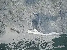Southwest of the main summit is the Grimmingtor, a roughly 50-metre-high and 15-metre-wide recess in the rock face, capped by a 10-metre-thick rock overhang. To the east it is bounded by a large rib of rock, which is why, in certain light conditions, it has the appearance of a gate (German: Tor). According to legend, rich treasures have been hidden behind this "gate".