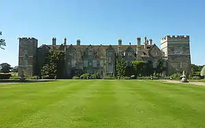 This grant by Henry VIII, Henry Tudor's son, to the 11th Baron Willoughby de Eresby was made in 1516, together with the hand in marriage of Maria de Salinas, a Spanish lady-in-waiting to Queen Catherine of Aragon. Their daughter Katherine inherited the title and estate on the death of her father in 1526, when she was aged just seven. In 1533, she became the fourth wife of Charles Brandon, 1st Duke of Suffolk, a close ally of Henry VIII. In 1539, Henry VIII granted Charles Suffolk the lands of the nearby suppressed Vaudey Abbey, founded in 1147, and he used its stone as building material for his new house. Suffolk set about extending and rebuilding his wife's house, and in only eighteen months it was ready for a visit in 1541 by King Henry, on his way to York to meet his nephew, James V of Scotland. In 1551, James's widow Mary of Guise also stayed at Grimsthorpe.[3] The house stands on glacial till and it seems that the additions were hastily constructed. Substantial repairs were required later owing to the poor state of the foundations, but much of this Tudor house can still be seen today.