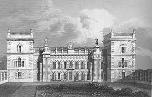 By 1707, when Grimsthorpe was illustrated in Britannia Illustrata, the 15th Baron Willoughby de Eresby and 3rd Earl Lindsey had rebuilt the north front of Grimsthorpe in the classical style. However, in 1715, Robert Bertie, the 16th Baron Willoughby de Eresby, employed Sir John Vanbrugh to design a baroque front to the house to celebrate his ennoblement as the first Duke of Ancaster and Kesteven. It is Vanbrugh's last masterpiece. He also prepared designs for the reconstruction of the other three ranges of the house, but they were not carried out. His proposed elevation for the south front was in the Palladian style, which was just coming into fashion, and is quite different from all of his built designs.[2]