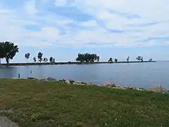 The Grindstone City Historic District consists of about 250 acres of land, including quarry sites and two original buildings. At the time of nomination, there were no other buildings on the site, although subsequently a portion has been turned into a subdivision. Most of the quarry pits have been filled with rubble, and trees cover the operations. Two jetties extend out into Lake Huron.[2]