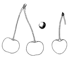 Fruit: medium size, generally attached in pairs, roundish-cordate to roundish-oblate, sides often compressed; suture shallow, often a line; stem long, slender, set in a wide, deep cavity. Skin tough, clinging to the flesh, glossy, dark brownish-red, deep black when ripe. Stalk 50 mm long. It ripens at the end of July.