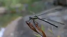 Griseargiolestes eboracus is a medium-sized damselfly, black-green metallic in colour with yellow markings; adults have pruinescence on the body,[4] but not the tail.[6] Like other members of the family Megapodagrionidae, it rests with its wings outspread.[6]