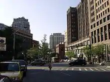 ![]() Griswold Street looking north from State Street, with the former DDOT downtown layover area and Industrial-Stevens Apartments visible to the left. | |||