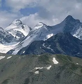 ![]() The Große Eiskogel in the centre. Left: the Zebrù; right: the Thurwieserspitze | |