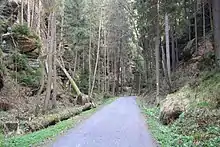 The Großer Zschand is the longest dry valley in Saxon Switzerland and runs for about 6 km from the Neumann Mill in the Kirnitzsch valley to the Roßmaulwiese meadown in Bohemian Switzerland. The Großer Zschand has no permanent watercourse; during times of snowmelt or after heavy rain, individual, locally limited watercourses and small marshy areas are formed.