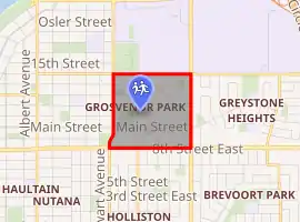 Grosvenor Park is located within the Nutana Suburban Development Area. It is bounded by 14th Street to the north, 8th Street to the south, Cumberland Avenue to the west, and Preston Avenue to the east. Roads are laid out in a mix of crescents and avenues. Main Street is a minor arterial street in the south part of the neighbourhood, separating the single detached housing area to the north from the apartment buildings to the south.