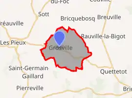 The arms of Grosville are blazoned : Per fess 1: Azure, a crescent Or between 2 towers argent open and pierced of the field, masoned sable, and in chief in fess 3 mullets Or; 2: per pale A: Argent, an eagle (displayed) sable membered Or, and B: Azure, 3 fesses enhanced argent, overall a chevron gules, in base a rose argent.